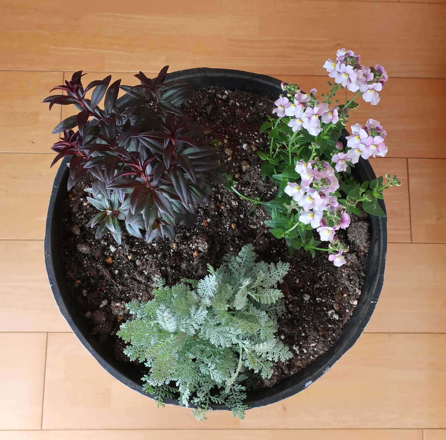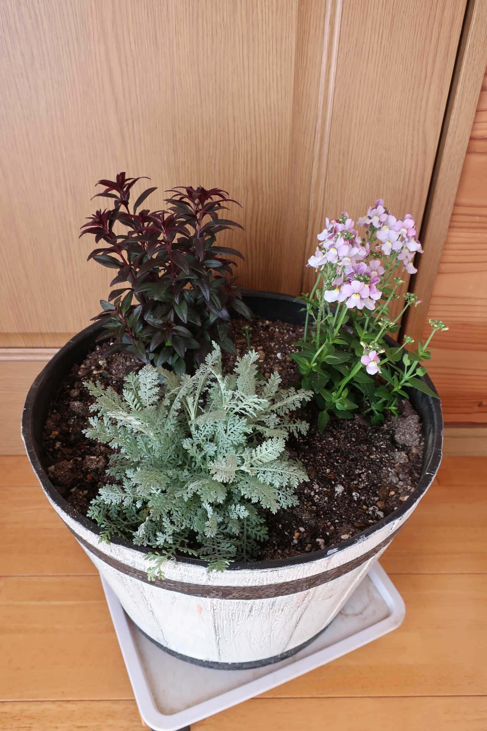 あとの宿根ネメシア、宿根キンギョソウ、シルバーレースは、庭に置いている樽型のプラ鉢をもう1つ、コメリで買ってきて、寄植えにしてみた。