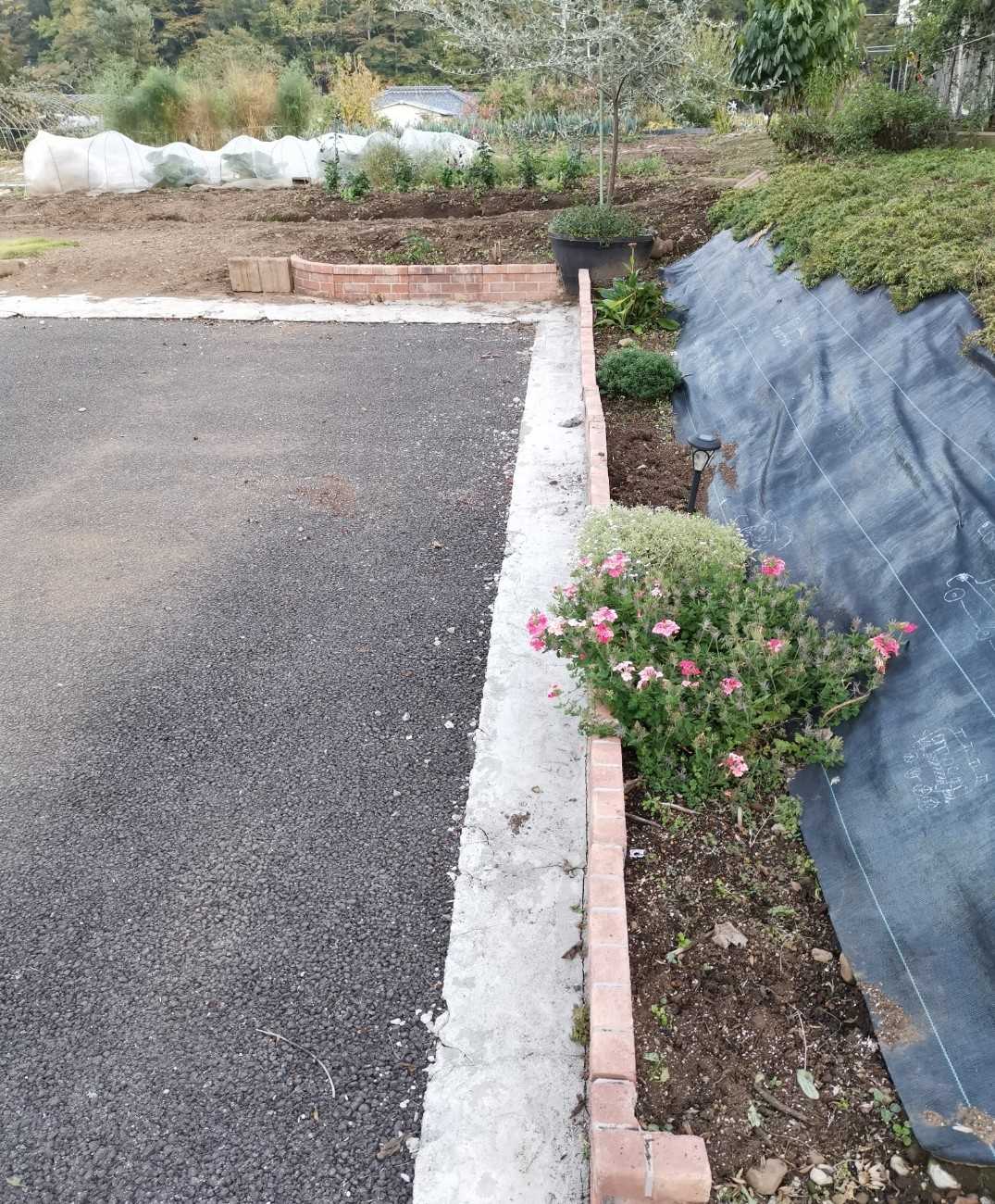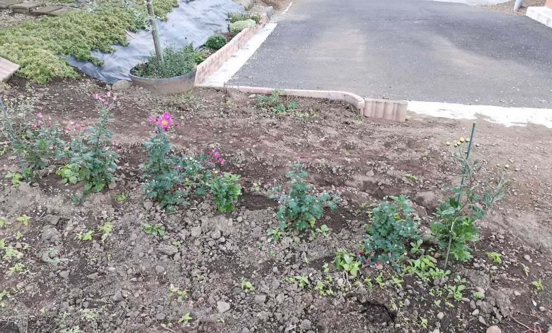 菊だけ残して、マリーゴールドを抜いた境界線。