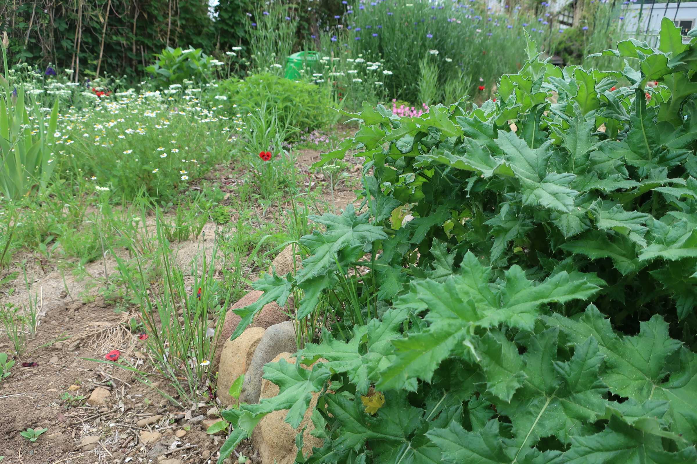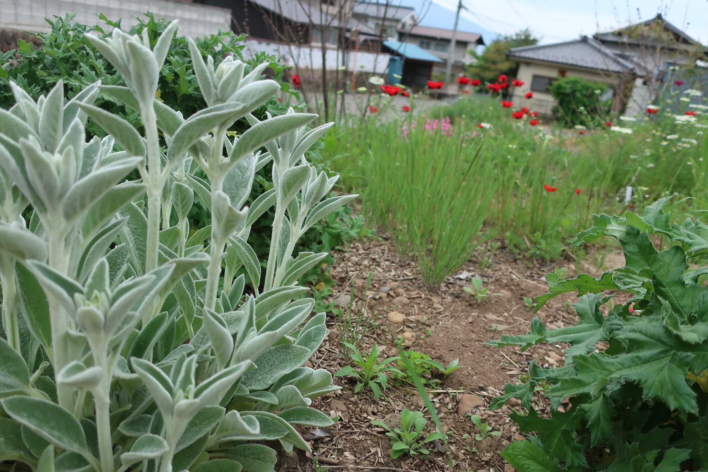 主庭で増え過ぎたラムズイヤーを少し移植したら、これまた大株に……。痩せ地のほうがいいの?