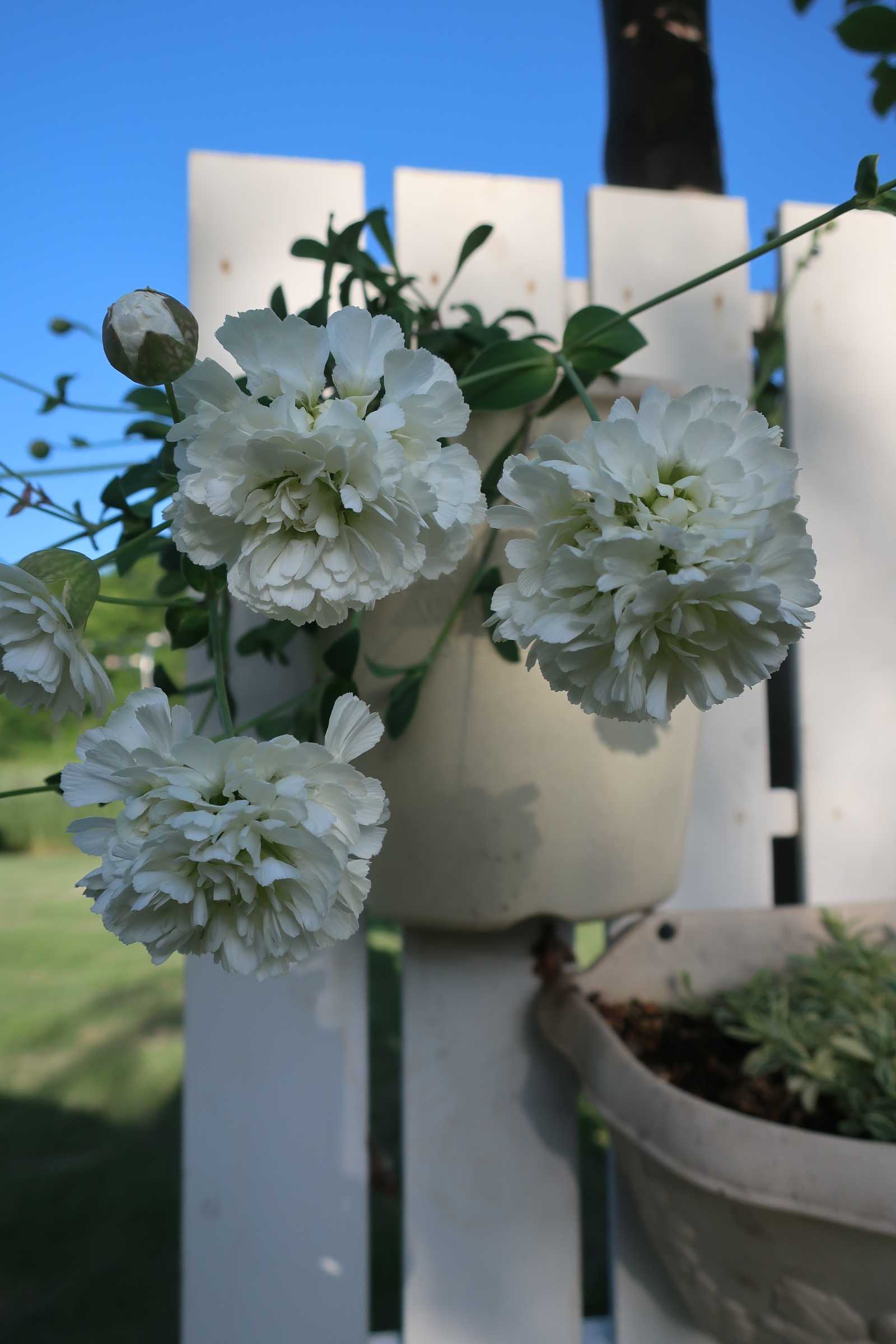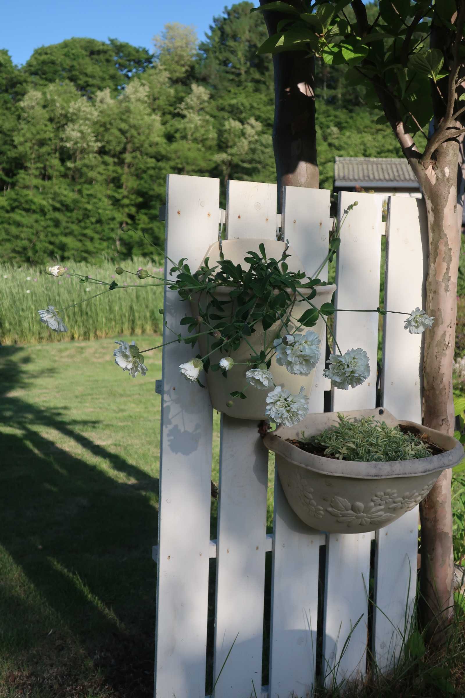 シャラノキの木陰に、ハンギングになっているのは、上が八重咲きのシレネ・スワンレイク、下が斑入り葉のシレネ・ユニフローラ・バリエガータ。