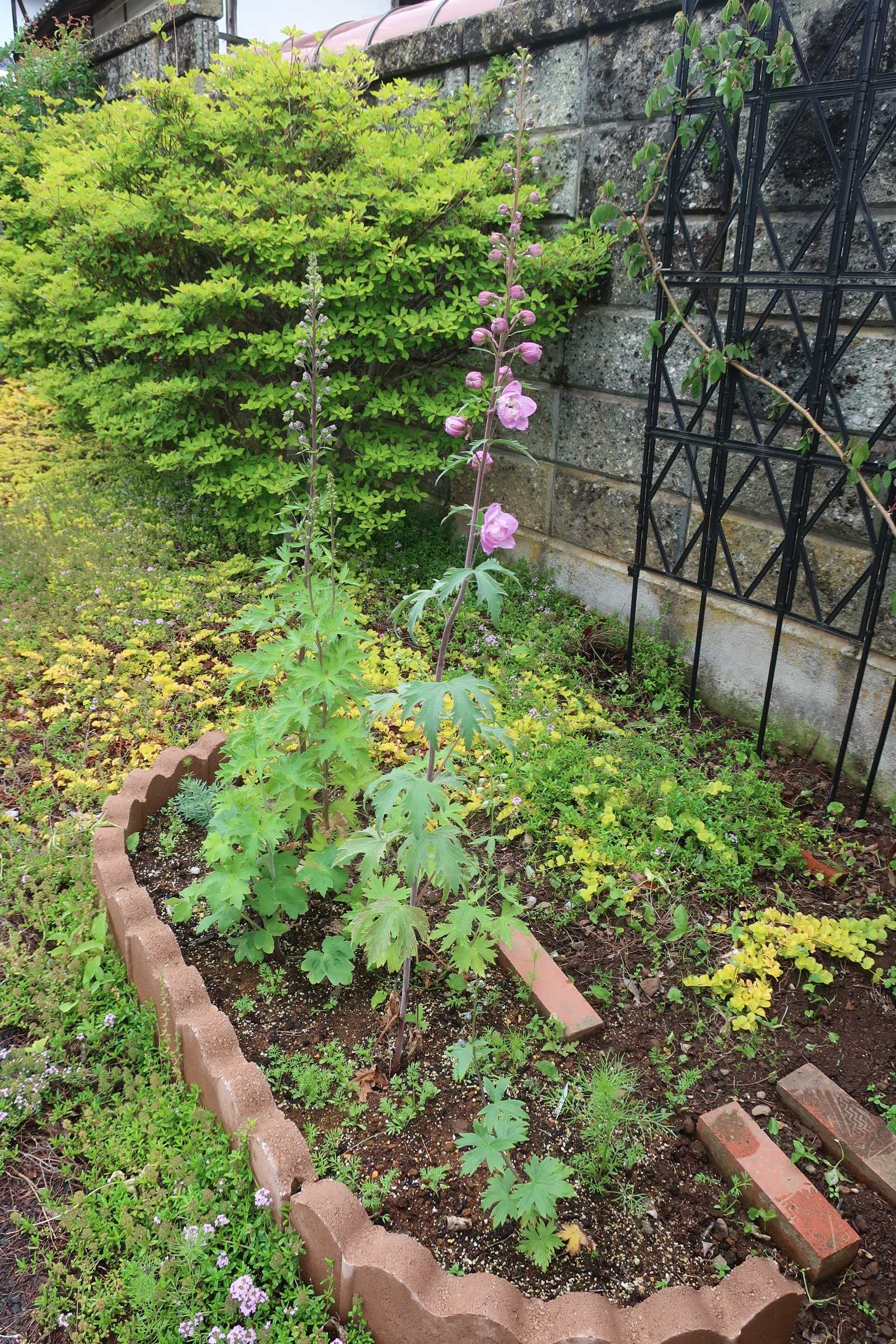これは去年の春に種蒔きをして、越夏越冬したデルフィニウム。ピンクっぽい?