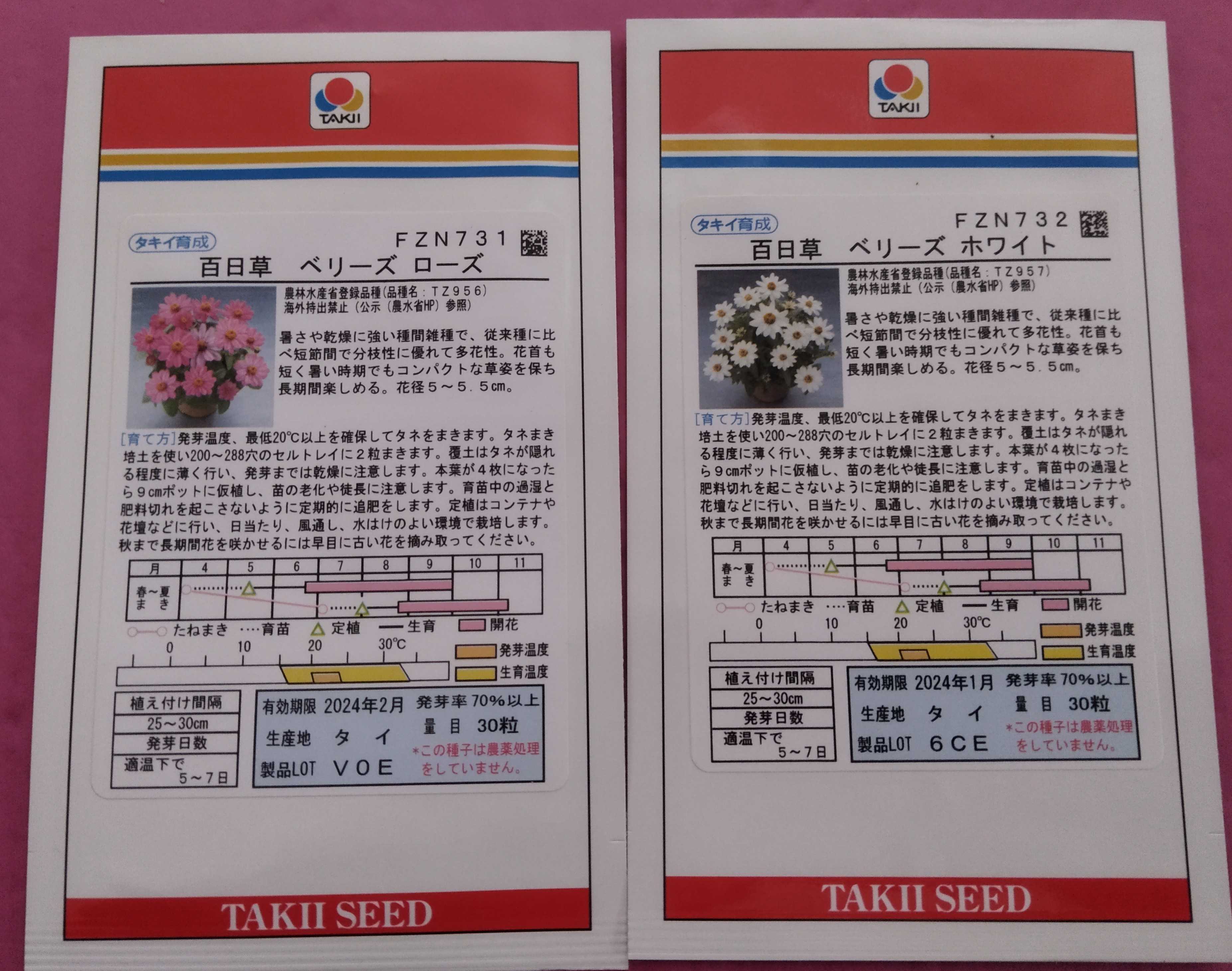 ジニア・プロフュージョンを3年育てたので、ちょっと違う色を育ててみたいと思って、「タキイ種苗」さんのベリーズシリーズのローズとホワイト。