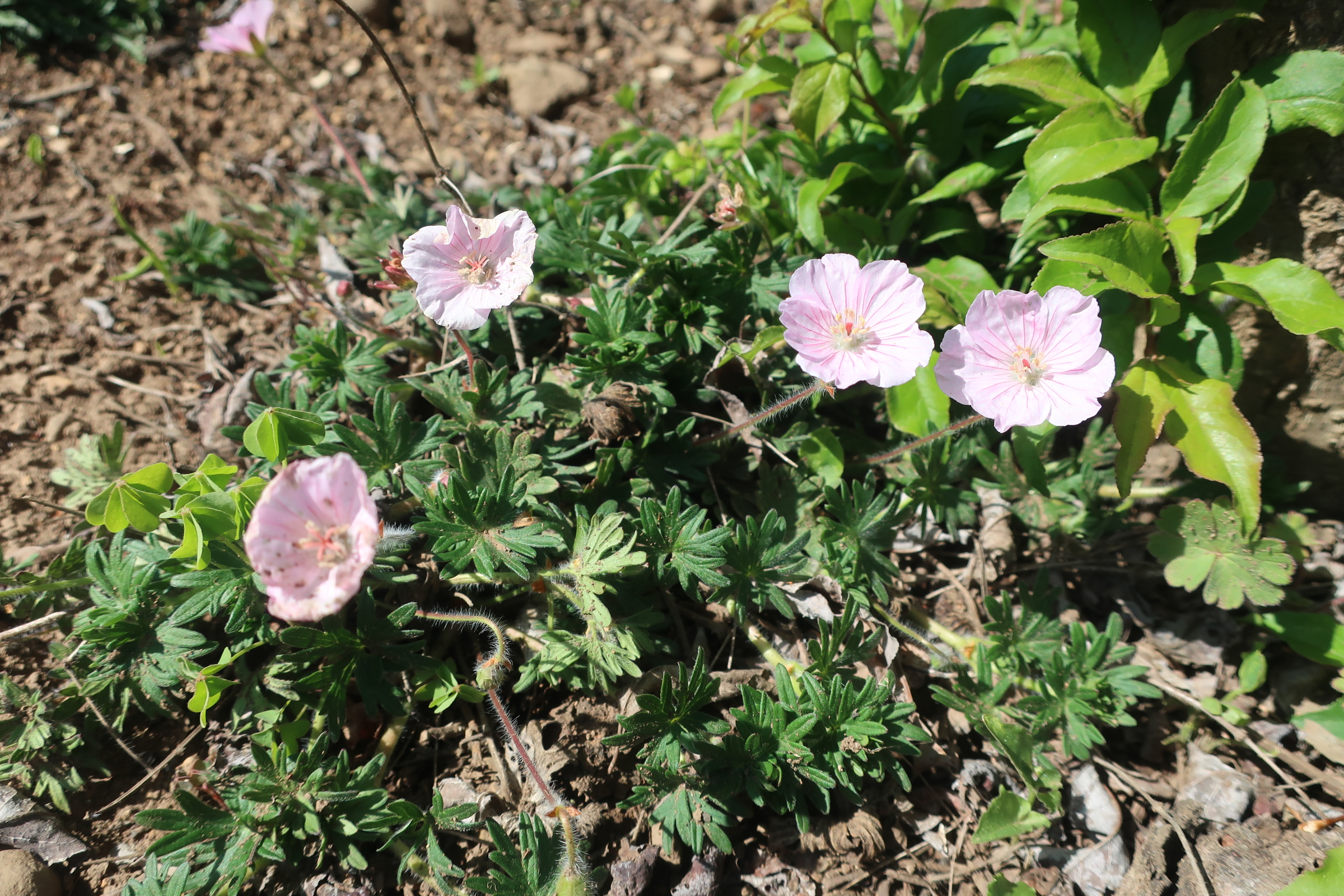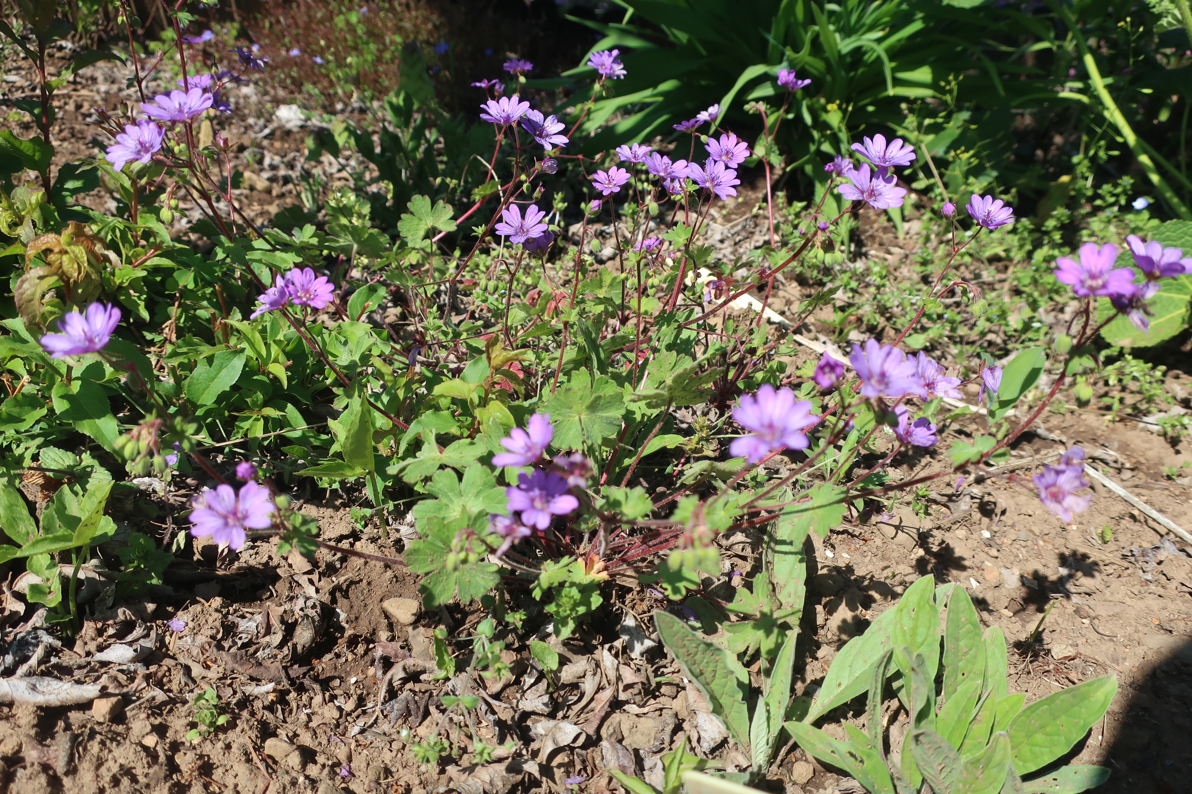 薄いピンクのゲラニウム。 宿根して大株になるし、時々零れ種からも生える。