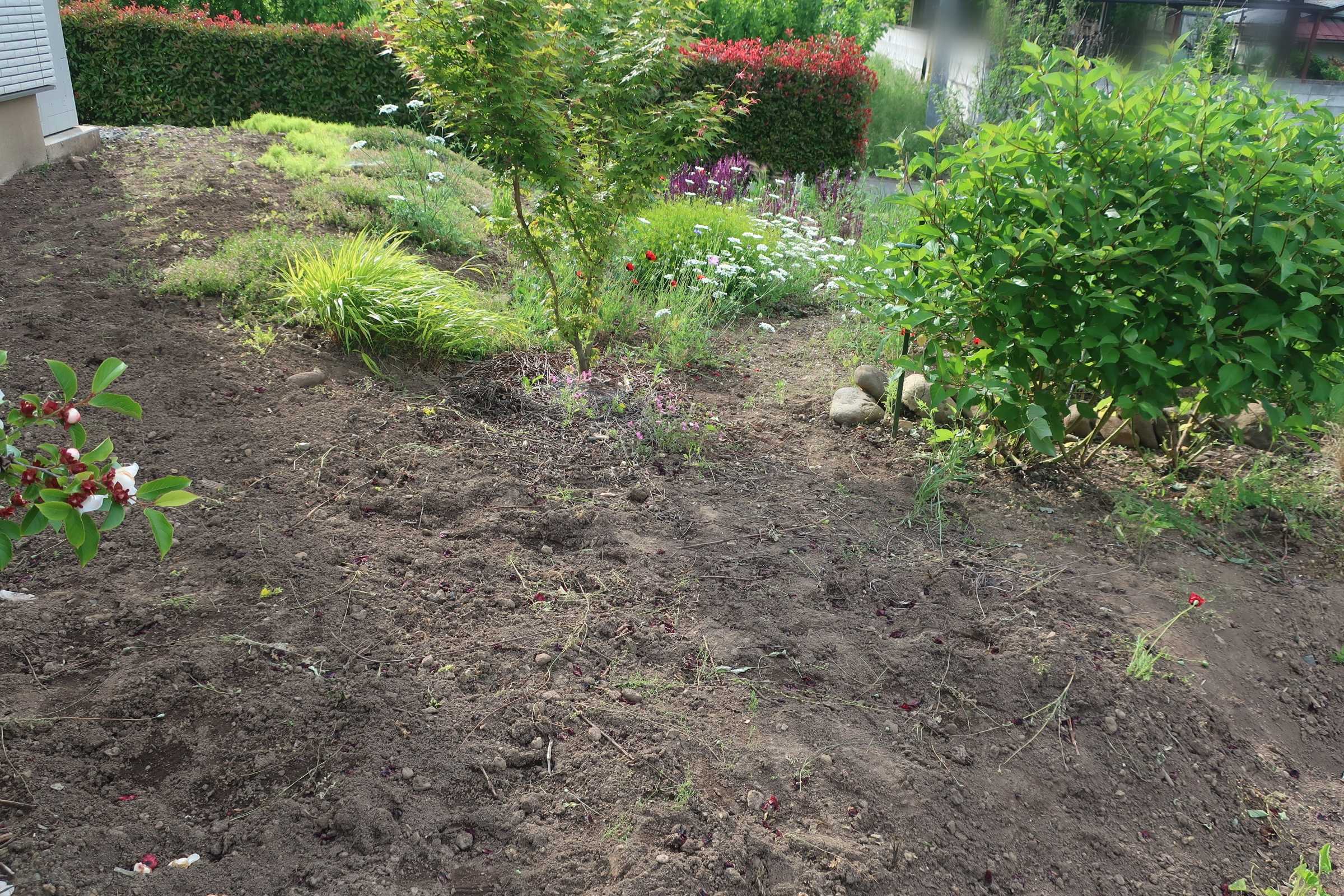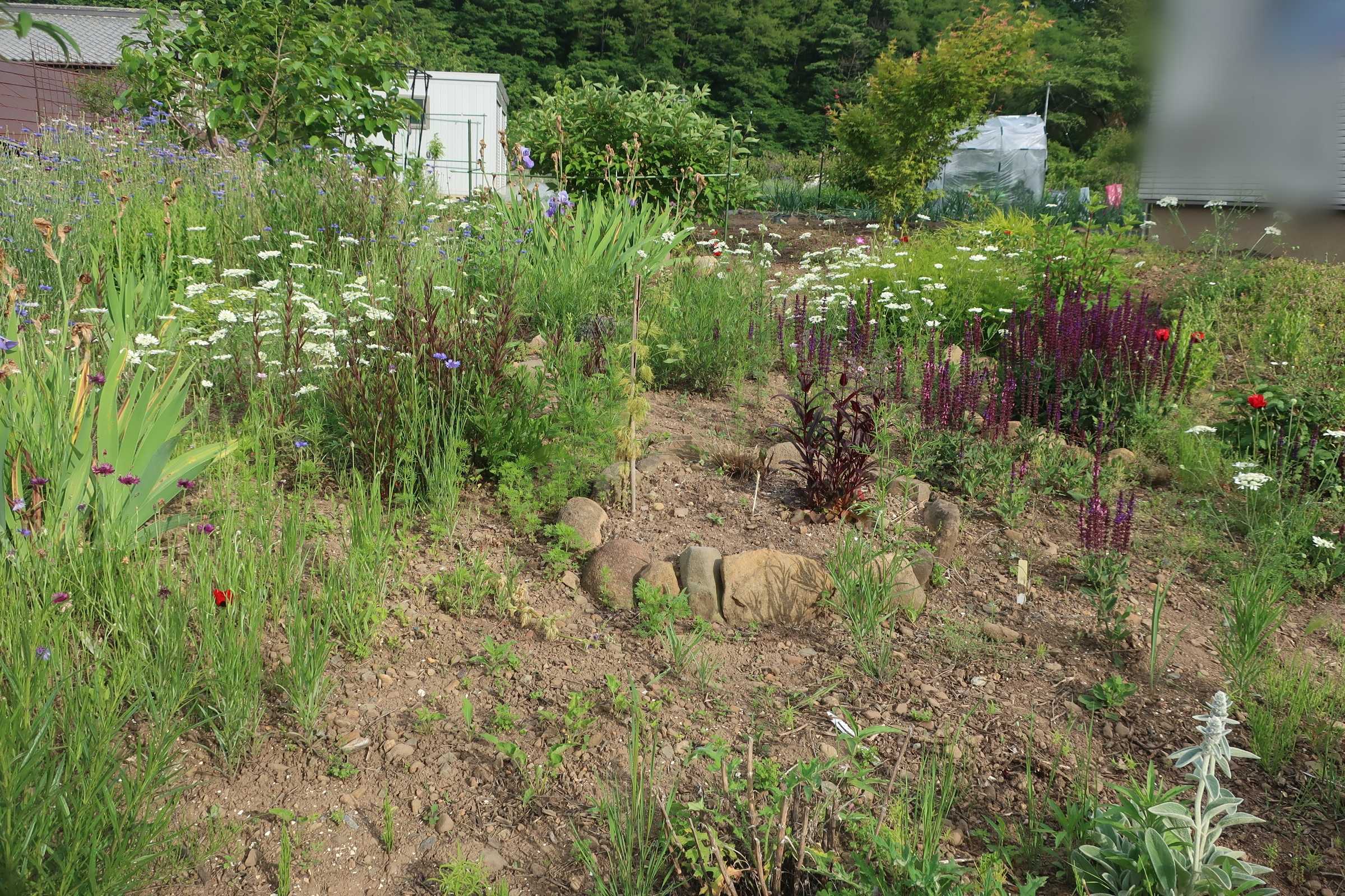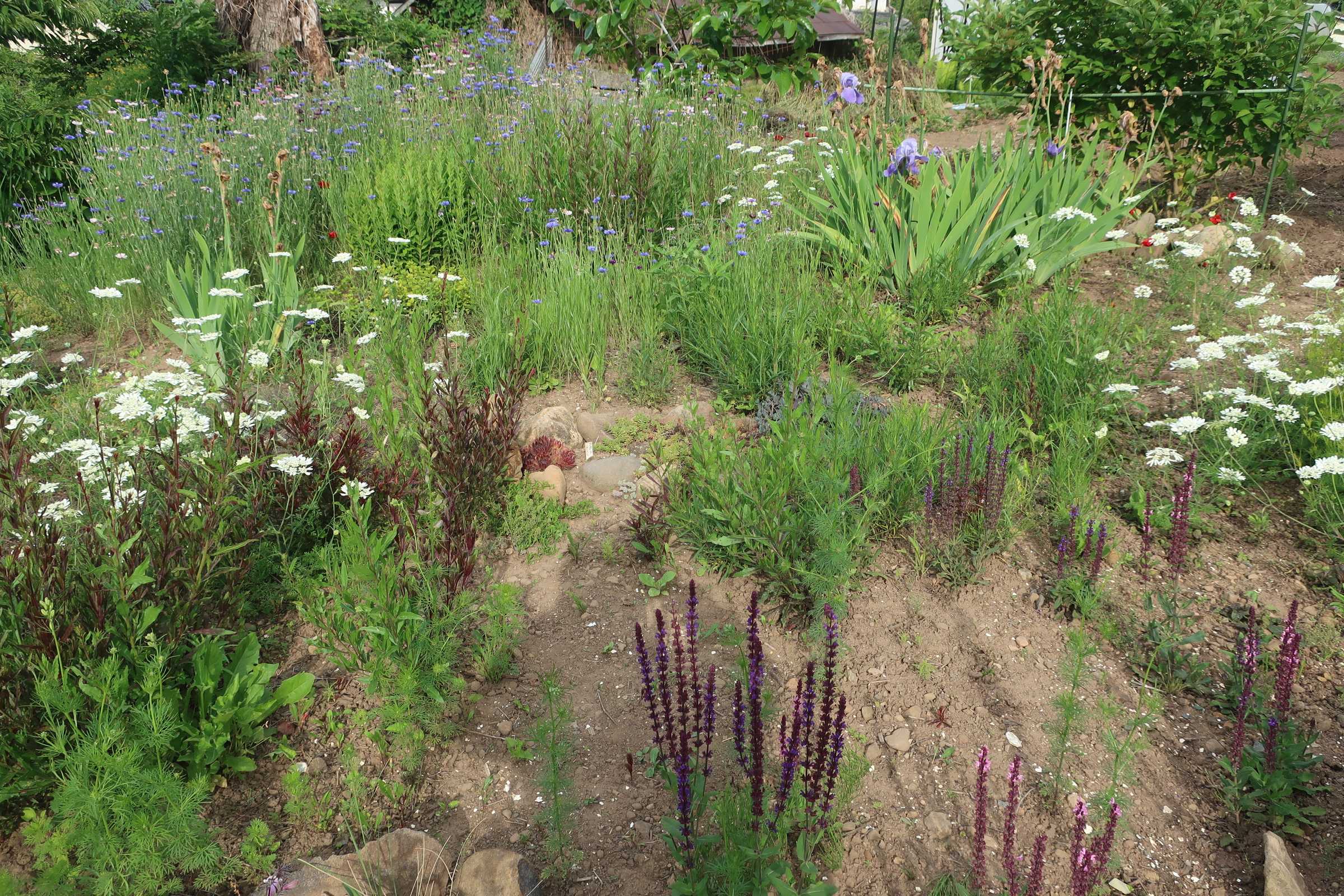 左奥のヤグルマギクと中央のジャーマンアイリスは、もう少ししたら抜いたり切ったりするつもり。