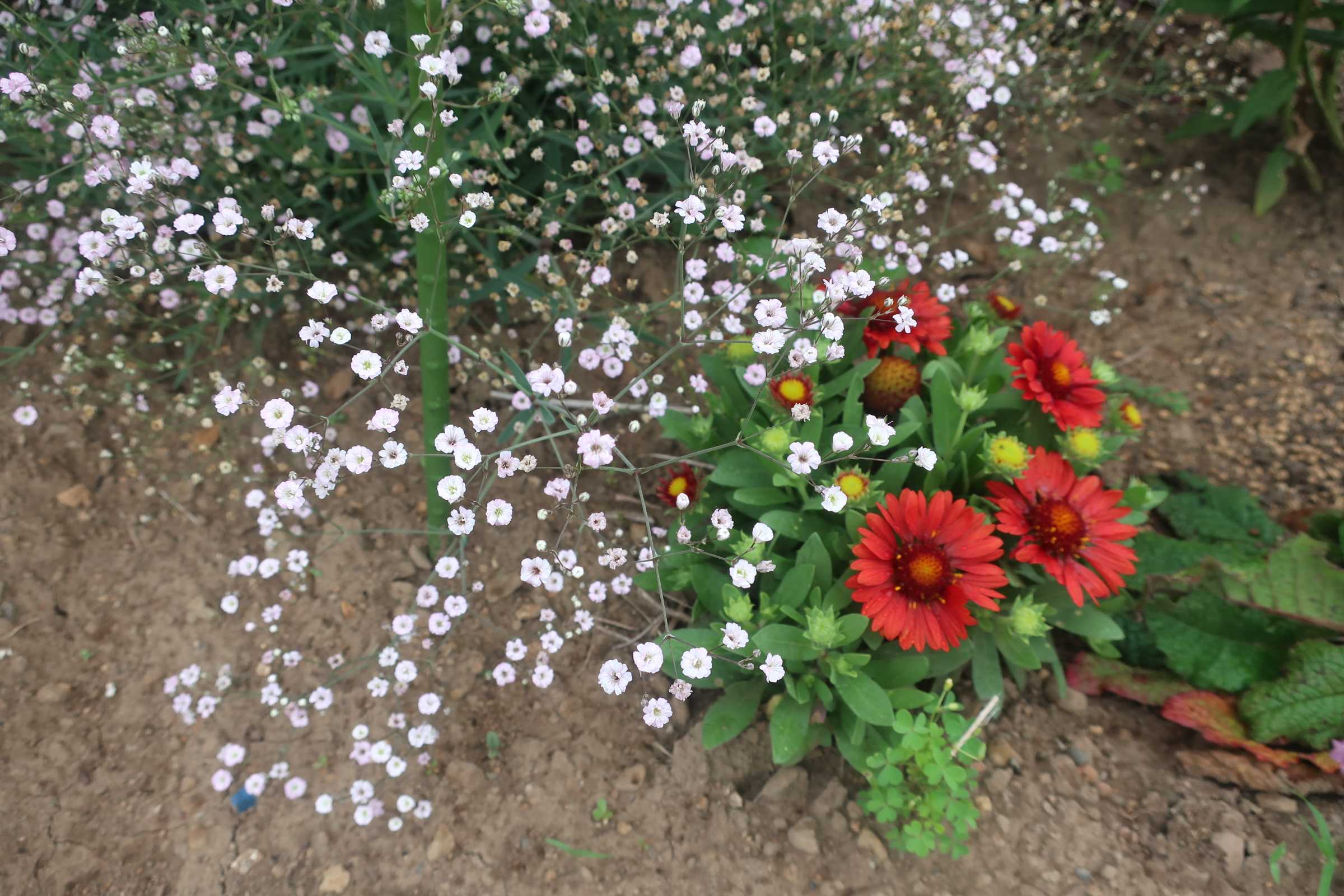 ピンクのカスミソウは立ち上がらず、這うように咲く。 赤いのはガイラルディア・アリゾナレッドシェード。