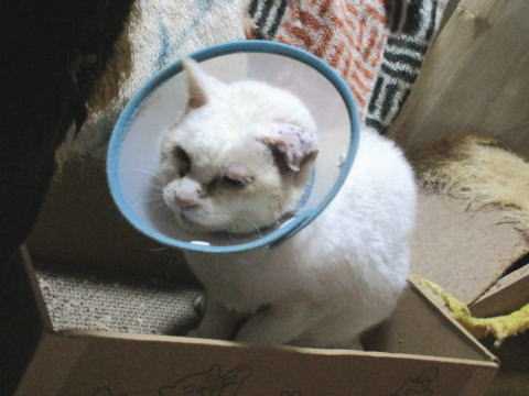 蘭♀いつものチェアー下の爪とぎ箱の中、少しお口が開いてるけど、ニャーと鳴いてたの?