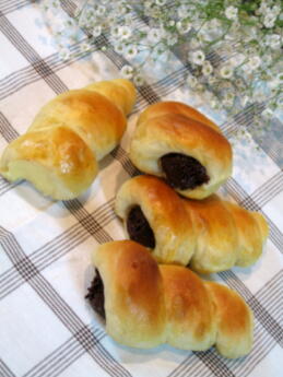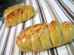 買い物に行ったら『手作りチョココロネセット』というのがありました。お買い得品で200円・・・。お父さんがいつか作ってと言っていたコルネはもちろんコルネ型が必要です。。。。。この中に型も入ってる^^。たぶん紙のだろうけど!粉末のチョコクリームとパンのミックスとチョコチップも入ってます。とりあえずこれで「コルネ」作ってみましょう♪パン生地は普通にみかさんのリッチ生地をHBにお願いしてコルネ型にはサラダオイルを塗ってから巻き巻き。。。2次発酵は昨日のタルトレットを焼いた余熱で発酵させたらま・まずい・・・発酵させすぎみたい!しかも、乱れた枝のように型からはずれてびよんびよん!やっちゃった~(≧∇≦)!!あたふた手直しして綴じ目を下にするためにひっくり返しちゃったし!あれれ~もう知らないっとσ(^_^;)焼き上がりは・・・いかにも過発酵で生地の状態悪ですが なんとか形にはなりました(;⌒▽⌒Aタルトレットの残りのカスタードもひとつ♪チョコクリームはちょっと粉っぽい味になってしまうけれど面白かったです~☆紙の型でも何回かは使えそうなんで(貧乏症~^^;)またチャレンジします♪ 問題:どっちが頭でしょう? て、わかるか(笑)