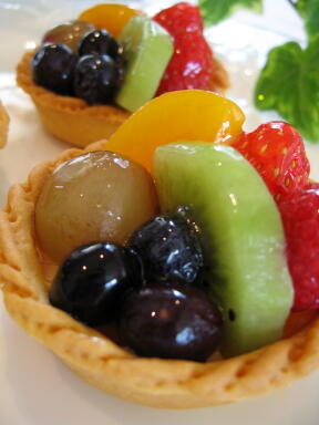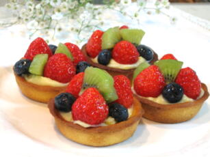 先日とってもキレイで喜んで買ったのに帰り道で粉々に崩れてしまったタルトレット。こういうの。。。って思って作りたかったけれど、やっぱり全然違うみたい^^; ケーキ屋さんのはフルーツは苺にキウイに黄桃、ブルーベリー、ラズベリー、マスカットがのってたんですが、秋に冷凍してあった巨峰で。(秋・・・古いですね==;)カスタードと生クリームを合わせてラムの香りづけ・・・。ちょっと少なかったな・・・もっと入れればよかったです(o^-^o)タルトの端っこはぎざぎざのピンセットでつまんで模様をつけてあります。藤野真紀子さんのタルトはこうなってますよね。一手間でまた印象はずい分変わるものですね。。。。☆