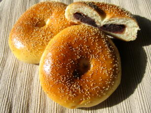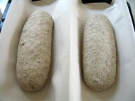 HBでパン焼きを始めて早2ヶ月。。。こんなパンが焼きたかった。。。。バリッとした外皮のクープの入った田舎パン。でも、我が家のオーブンったら最高温度が200度!の非力もの^^;フランスパンやクロワッサン、カンパーニュ・・・レシピによっても違うけれど焼成温度は250度やら230度やら書いてあります。まだまだ無理だろうな、オーブン新しいのにしちゃいたいななんて思いつつ見切り発進してしまいました^^;レシピはe-ぱん工房さんのライ麦パン。それに胡桃を入れることにしました。e-ぱん工房さんのレシピは字が多いので結構難しいんですよね^^;(爆)これも発酵種を前日の夜に仕込んでおくというものです。はじめは生種のことかと思いましたがよく読んでるとドライイーストでいいんですね・・・。このレシピを選んだのは「発酵種とヨーグルトを使った食べ易いライ麦パン」というところなんです♪ヨーグルトが入ってソフトさがでるようです。 成型後折りたたんだキャンバス地に寝かせ 2次発酵でこんなに!発酵しすぎてますか???レシピに2次発酵が50分とあったのでその間に急いで球太の散歩へ行ったのですが帰宅後すぐ見るとちょっと発酵しすぎてるようなΣ( ̄ロ ̄lll)球太の足を洗うのは後!玄関で待ってて!!!!急いでクープを入れちゃったからまたこんなだ~!!そうそう私は絶対ごまをたっぷりくっつけて焼きたいんです☆クープを入れてから大量のごまとポピーシードもばらばら!ってことはクープの中に溜まるという良くない結果ではあります^^;ライ麦粉も少し振ってからオーブンへ。でもね、やっぱり残念、230度の余熱は無理ですから。初めから200度で霧吹きで蒸気を入れる程度の真似事をして(* ̄m ̄) 焼きました。焼き上がりはやっぱりどう見ても焼きが甘い。。。(レシピと全く違うパンですので見比べないでね^^) クープはいろいろで変です! あれっ、胡桃が見えないですね^^;バリッとしたかっこいいパンじゃないんですけれど・・・これが美味しい!!!胡桃とごまの香ばしさがまたいいんです♪ライ麦の噛むほどに味わいのあるパン♪マーガリンとメープルで・・・ああ。。。美味しい!!とりあえずは大満足(o^-^o) 「ころころ球太!明日トリミングしてくるからね♪」by球太