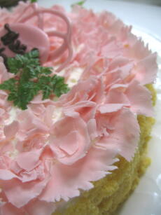今日は母の日☆カーネーションのケーキを作りました。ばーちゃんと自分のため????( ̄▽ ̄*)ゞ 昨日の日記にも登場した苺のソースを生クリームに合わせて苺色のクリームをサンド。『キハチ』だったかな~?カーネーションの素敵なケーキを真似・・・はできないけれど^^;ストロベリーチョコを削ってデコしてみました。スポンジは***jukaiko***さんのオススメトレハロースをグラニュー糖の分量の1/3置き換えて焼いてみましたよ^^。ほんとにすごくしっとり♪キメの粗さに悩んでたので前回のロールケーキの作り方で粉を入れてからかなりしっかり混ぜてみました。いつもの高さまで膨らみませんでしたので失敗か@@;と思いましたが出来上がってみるといい感じです。まだもうちょっと何度か焼いてみて加減を調節した方がよさそうですけれど(#^.^#)トレハロース******ジャガイモなどのでんぷんを酵素で分解して作る天然の糖質。保湿成分が高く甘さは砂糖の45%。砂糖とともに用いるとしっとり感が増し軽い甘さに仕上げる事ができる。