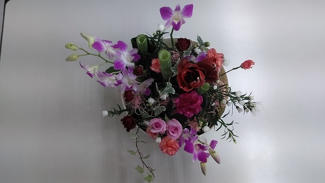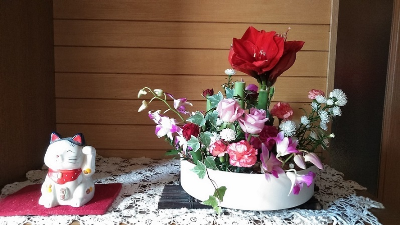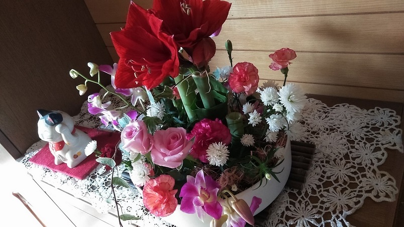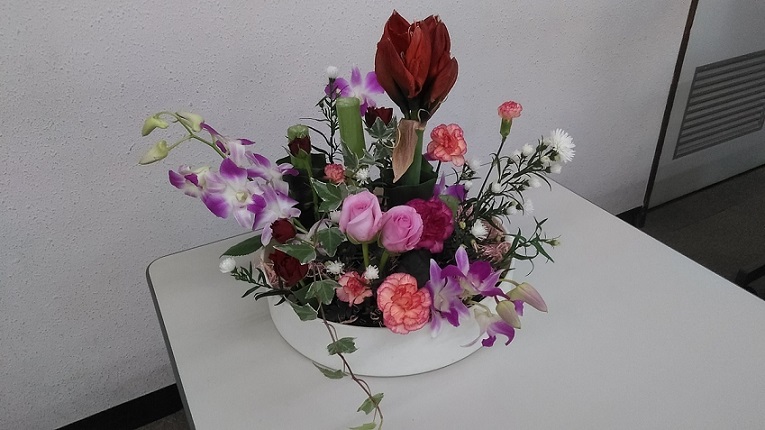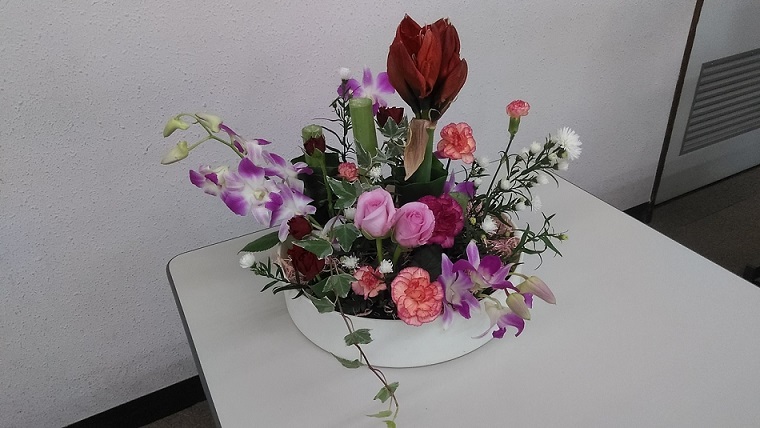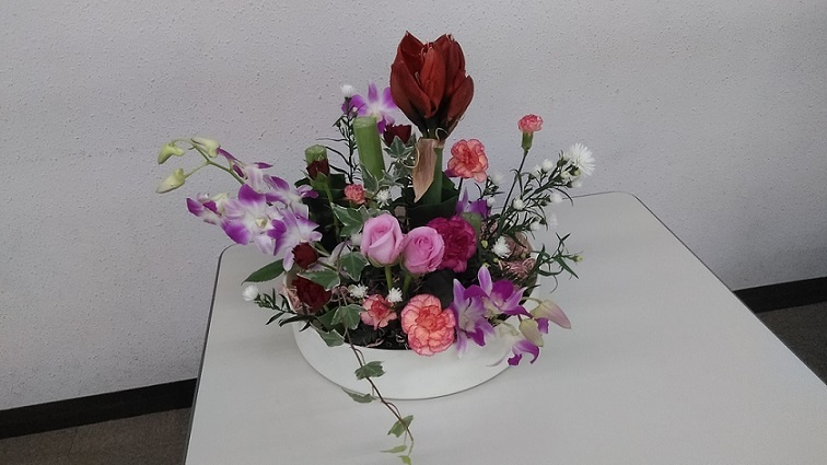 先生のチェック「うん。アマリリスが倒れてこない様にしっかり挿して。あと(ピンクの)バラ1本だけこうかためてもいいかな」