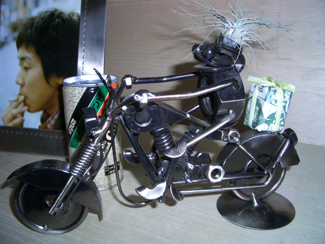 7月14日は大樹の25回目の誕生日主がいなくなってもお友達からの おめでとうメールが届いてとても嬉しいことです。ところが不覚にも前の日から体調を崩して病院で点滴を受けるはめになりました。ケーキも買いにいけず・・・・来年は達ママのようにケーキを作りたいです。でも行きつけの花屋の方に思わぬエアープランツをヘルメット代わりにそして皆へのプレゼントを載せて走るバイクをいただきました。ナットやワッシャーなどでできたものです。見れば見るほど 楽しくなりますね。感謝感謝で~す。