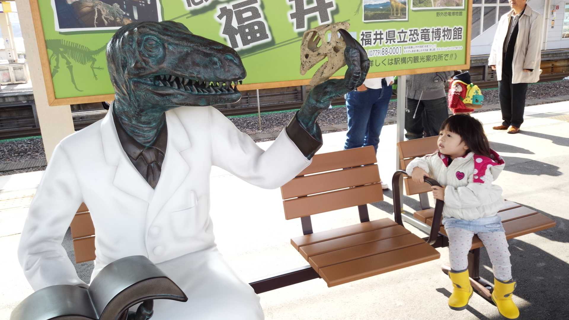 こんにちは。今日も朝から晴天で花見に行かれている人が多いようですよ昨日の恐竜ベンチにコメントを頂きましたので駅のホームにある恐竜ベンチをのせますね7年前の写真です孫のあ~ちゃんと汽車で福井市迄お出かけしました福井駅前には大きな恐竜がいますよ首も動きます応援お願い致しますにほんブログ村