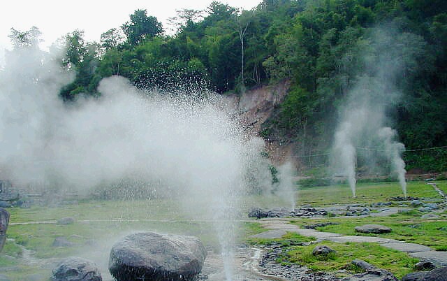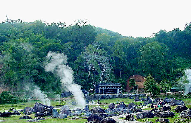 ↑ タイ北部チェンマイにある温泉公園 チェンマイやランパーンなどのあるタイ北部地方は、多く温泉が点在し、温泉公園として整備された温泉地から未だ開発されてない山の中の自然温泉まで、さらに「温泉の滝」までいろいろな温泉が点在している。 公園化された温泉地では、日本のように(日本の真似か?)各温泉の「温度表示」「成分」「効能」などが英語とタイ語で説明書きされている。 高さ7~8mまで沸騰したお湯(熱湯水)が噴出しているポイントもあり、そういうところは、近寄れないようにフェンスで囲いがされている....所もある。 温泉のつくりは、公園によって多少異なるが、レンガ造りの小さな小屋の中に脱衣室と湯船室があり、 湯船のお湯は、人が変わる度に「新しい湯」に入れ替えている。 真中に穴がひとつあって、その穴一つでお湯の出し入れが行われている。 温泉の入り方だが、一人で使用する場合はスッポンポンでも構わないが、現地では日本のようにスッポンポンで入浴する習慣はないので、間違ってもタイの人たちの前でスッポンポンにならないように。 ヒンシュクをかわれること間違いなし。 日本のような集団浴場の文化は、タイの人たちの目には、下品に写るらしい。 タイでは、サウナや温泉など他の客も多くいるような所では、水着より少し大きめの「半ズボン」を貸し出している。 温泉公園の中を歩くと日本同様に、あの温泉独特の香り「硫黄の香り」が漂っている。 この温泉の香り成分「硫黄(Sulfer)」だが、熟したタマネギやドリアンのあの独特の臭さ(香気成分)の張本人でもあることを知る人は、意外と少ない。 序に、タイでは、ドリアンと酒を同時に摂取すると、体が熱くなって血圧が上がって死ぬとか、いろんなガセネタが広がって、それらを鵜呑みにし実際、信じている人も多いが、熱帯果樹や食品分析化学など各分野において、その因果関係が実証されたという報告例はない。 温泉公園内の売店などでは、日本のように温泉タマゴ用の生タマゴも販売されている。 ここ数年、日本からのロングステイ組が増えているチェンマイだが、移り住む日本人の中には、こうした温泉地の近くに移り住む人も最近、徐々に増えてきている。