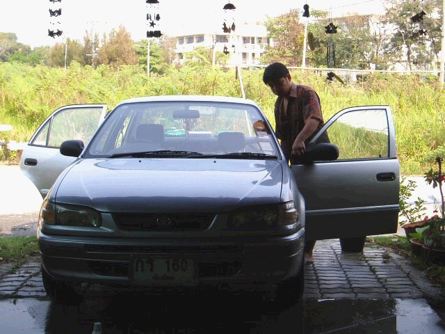 チェンマイのオーちゃんとヌンは、ラチャパット大学構内にある職員用住宅に住んでいる。 光熱費以外は、タダ。 おとといの日曜日は、久しぶりに一日中、家でのんびりしてたそうだ。 ヌンは、久しぶりに洗車に励んでいたそうだ。 写真を添えてメールで送ってきてくれた。 しかし、久しぶりに見るヌンとオーの自宅の様子。なつかしい~!....ところで、ヌンたち、いつのまに「車」が替わっている。 あの赤色の色褪せたピックアップ車の姿が見えない!????........オーちゃんに尋ねると、あのヌンの使っていた車とオーちゃんの緑色の車、あの2台は、売り飛ばしたそうだ。 そして、この車に買い換えたようだ。 だから今は、この1台だけ....とのこと。 しかし、以前の2台の車に比べ、随分、いい車に切り替えたもんだ。 TOYOTA COROLLA DXI.....一昨年の9月に購入したようだ。....いくらしたの?ってオーちゃんに聞くと、「205000B(当時のレートで、66万円くらい?)」で買ったそうだ。 年式は、2540年(西暦では、1997年式)モノで、買った時は、8年モノの中古車。.....で、66万円?....日本の中古車市場より、高いね~ それにしても、そんな大金、どこにあったの?...オーちゃんに聞くと、<一括では、無理なので、市内の中古車販売店で、「ローン払い」で購入した>そうだ。 ローン契約は、4年間で、月々<4009B>ずつ支払っていくそうだ。 これまでのところ、故障などなく、乗り心地も快適だそうだ。 冷暖房のことをきくと、エアコンは付いてるが、ヒーターは、付いてないらしい。 タイを走ってる日本車って、ほとんどヒーター付いてないんだよね。 冬になると、北部山岳地方は、10度を下るところもあり、需要はあると思うのだが。 しかし、自宅前の草、ずいぶん伸びたもんだ。 遠くに薄っすらと見える白い建物が日頃、オーちゃんが勤めている事務所で、普段は、いつもそこからメールを送信しているが、しかし時々、そこから「ノートパソコン」を自宅まで持って来て、無線を使って、夜遅くまで、チャットメール&ボイスメールをすることもある。 便利な世の中になったもんだ。