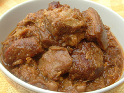 ↑ゲーン・ハンレー(タイのポークカレー) タイ北部で食されているポークカレーだが、ポークの替わりに、ビーフやチキンを煮込んだカレーもある。 < 材 料 1 > < 材 料 2 > 1. 豚 肉 1kg 1.レモングラス 8g 2. 豚肉(3枚肉) 500g 2.乾燥トウガラシ 5g 3. カレーパウダー 15g 3. カー 7g 4. ショウガの千切り 40g 4.ニンニク 8g 5. ニンニク 65g 5. 小タマネギ 16g6. 大豆醤油 15g 6. ガピ(小エビの発酵味噌) 5g7. ナムタマリンドー 40g 7. 塩 5g8. 水 1リットル <材料.1>でお肉を煮込み、軟らかくなってきたところで、<材料.2>を混ぜ、煮込む。