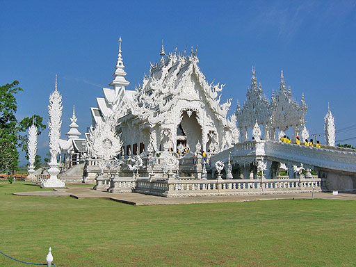 タイ最北部にあるチェンラーイ県に最近出来た新しい寺「ワット・ロンクーン寺」チェンマイに住むオーちゃんたちからメールが繋がった。今日のチェンマイは、朝から快晴で雲ひとつないほどディープブルーな青空が広がっているそうだ。気温は、28℃。今日は、ヌンは休みで、メーサ・キャンパスの事務所で久しぶりに一緒に昼食をとったそうだ。 自宅が近いこともあって、今日は、ヌン手作りの「カオパット・ガパオ(バジルの焼きめし)」だそうだ。多分、バジルの葉は、家の後ろに生えているあのバジルの葉を使ったんだろう。 年末年始は、故郷ウッタラジット県からの親戚11人がチェンマイに車3台(普通乗用車2台+ピックアップ車1台)で遊びに来て、チェンマイや隣りのチェンラーイ県まで各行楽地や寺を巡って来たそうだ。チェンラーイに最近できた白い寺にも行って来たそうだ。写真まで送ってきてくれたが、本当に白いね。 白い寺だ~! タイでは、一般に、金色に輝く寺が主流だが、真っ白い寺は、はじめて見たな。 新しいデザインだろうか? 新しい寺の名称は、「ワット・ロンクーン」。 チェンラーイ県の仏教建築の職人たちによって考案・設計されたデザインだそうだ。 ランナー王国時代のデザインを残して建てられたようですが、外壁の材質は細かいガラスを使用したそうだが、まさか、アスベストじゃないよね? チェンマイでは、「フラワーフェスティバル」そして「シリキット王妃植物園」を案内したそうだ。 観光地巡りとお寺巡りを兼ねた年末年始の親戚たちとの過ごし方! ↑ウッタラジット県から来たオーちゃんの親戚! 今のチェンマイの気候は、涼しそうな半袖姿を見ても分かるとおり、1月現在、チェンマイは夏です。 .....冬らしい冬のない国、年間を通して、冬服を着る機会が少ない本当に暖かい国で......羨ましいっす!