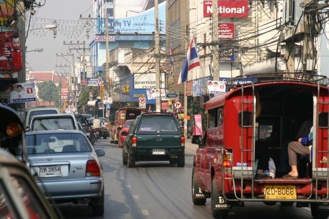 チェンマイでは、バンコクのように「タクシー」は極端に少なく、市内では、今でもピックアップ車の荷台に屋根と長イスを付けた「ソンテオ」という「乗合タクシー」が主流。他に、「トゥク・トゥク」と「人力車」「ミニ路線バス」が走っている。 タクシーも徐々に増えて来てはいるが街が小さいだけにどこまで普及するか。 市内は、一方通行の道が多い。