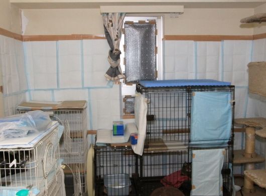 小窓に断熱シートを貼ると同時に、壁一面を消毒&ペットシーツの張替えを実施しました。