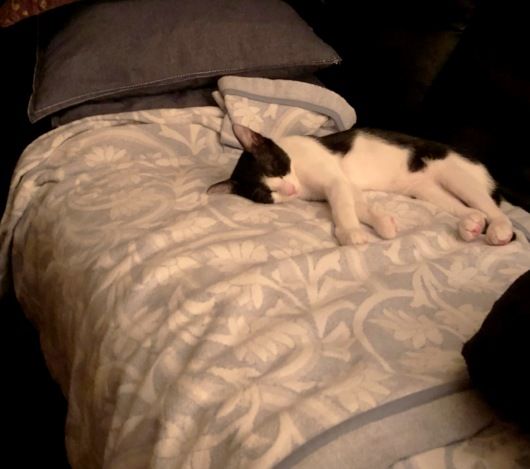 ベッドを空ちゃんに占領され、里親お父さんは、ベッドの下の床で寝る羽目に。