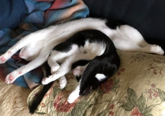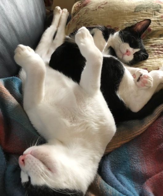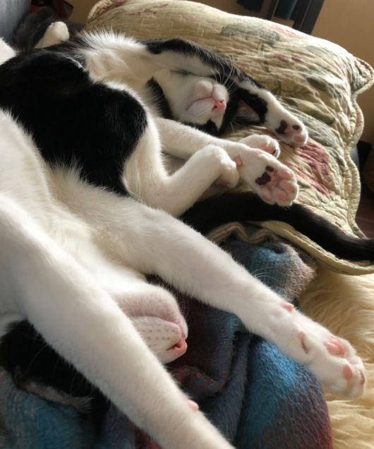 二人とも身体をねじりながら、前足を伸ばして、同じ体勢で寝ています。