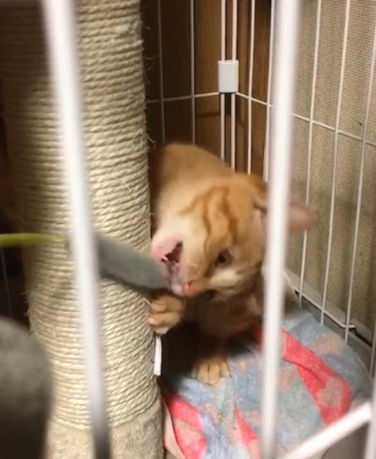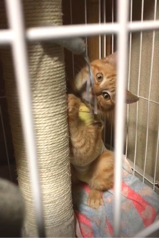 「ママが撫でられている間は、私はジャラシで遊びますニャ。」