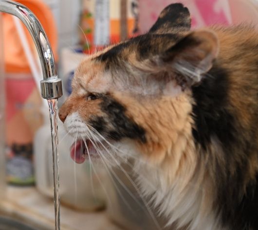 モモは、浄水器から出てくる水が大好きですが、見てのとおり、少し首を傾げれば良いものを、何故か、真っすぐのまま飲もうとして上手く飲めず、悩みぬいた末に辿り着いた結果がこれ。