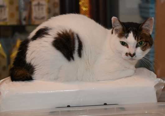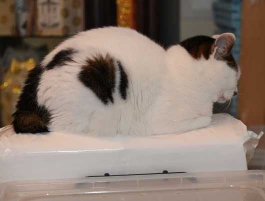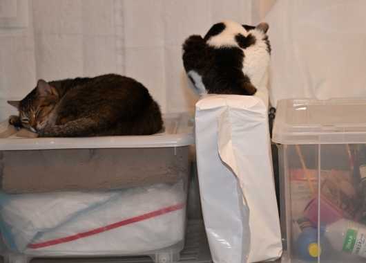 収納ケースの間に置いたペットシーツの上、まるで稜線の上に居るような状態