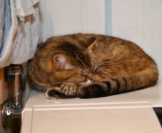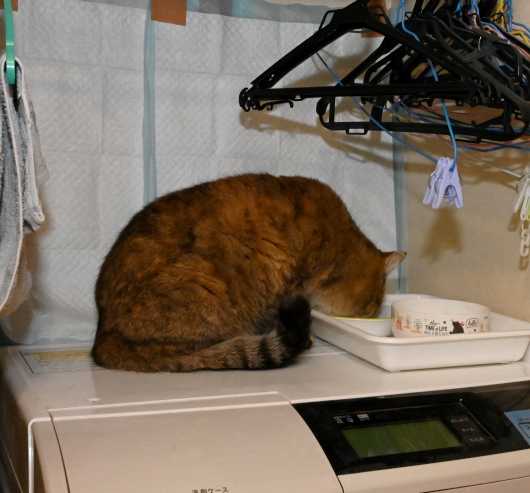 リビングやキッチンをウロウロした挙句、洗面所の洗濯機の上を、ねぐらに決めたようで、暫く様子を見る事にします。