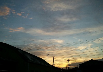 昨夜は帰省中の長男が高校時代の友人を集め、庭でバーベキュー。長男が剥離骨折で車の運転ができないので、買出しもお迎えも、もっぱら母が運転手。炭を買いに行ったホームセンターで撮った6時頃の空です。青い水に白い絵の具を落としたような、不思議な雲。大きくて全体は撮れませんでした。遠くに見えるのはイオンの観覧車です。ひとり遅れて来たJ君のために火を落とさず、腹七分目で待っているやさしい男の子たち。片付けたあとは、炉に向かってかわいく花火。バーベキューには必須のようです。 さて、今朝ですが、海老の殻の入った袋を片付けようとしたら、ガサガサ音が。まさか海老そんなわけありませんねバッタでした。