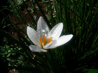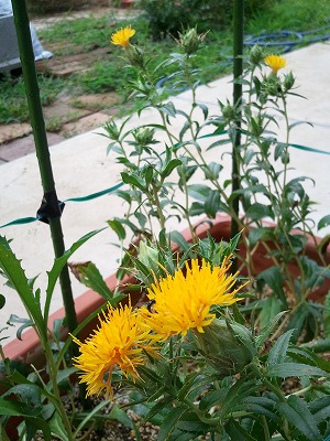 夜の間に雨が降ったようで、庭の土が黒ずんだいいお湿り具合です。花びらや葉っぱもしずくを乗せて、うれしそう。私も水遣りの手間が省けてうれしい いつもはもっと遅い時期に咲く、タマスダレが花を開きました。このタマスダレは亡くなった祖父の家の庭にあったものを、伯母、母、私と植え継いできました。祖父は寡黙な人でしたが、幼少時パセリ好きだった私のために小さなパセリ畑を作り、遊びに行くと摘んできてくれるやさしい人でした。●タマスダレもうひとつ初開花が近い紅花。以前ご紹介した、井上ひさし『雨』の公演でいただいた種を植えたものです。劇場ロビーを飾っていた紅花はこの3倍位の背丈だったので、開花はまだ先だと思っていたのですが。初秋を思わせる気候が続いているので、花たちも勘違いしているのかも。●紅花