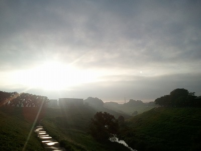 今朝は霧が立ち込めていて、朝日を浴びた景色を幻想的にしています。●運河●この右側土手の上にある散歩道 左側はT理科大の建物が並んでいます。●T理科大正門前を散歩する人と犬●この右手は大学の食堂です。 いい字なんですが、なんか変?正門脇の家の前で、集まった土木関係の職人さんたちを見送った犬。さびしい… な。台風の影響でしょうか、曇り空です。風はひんやり冷たく、秋の気配を運んできます。