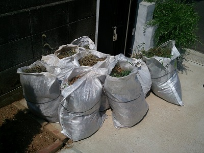 わが家の庭のメインテーマは草取りとなっている今日この頃。抜いた雑草はどうなるかご紹介します。ここでは、市の指定業者が雑草と剪定した枝を無料で回収してくれます。前もって電話して、袋に詰めて玄関先に置いておけば、中身だけ回収してくれます。つかの間ですが、すっきり。リビングから、まさ王製のおたまじゃくしはこの角度で見えます。アップにすると日照時間が長すぎて、少し心配な寄せ植え。 さて今日もいろいろな虫と挨拶を交わしました。擬態で身を隠せていると思うのか、バッタは間近でカシャッとシャッターを押しても動きません。蝶や鳥の写真が撮れるカメラが欲しいです。