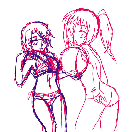 頂戴してまいりましたお絵描き工程バトンです。別に誰も知りたくないし、自分でもお見せするほどのものでもないと思うのですが。一度くらい、こうゆう公開羞恥プレイも良いかと(笑)あ、別に特に変わったやり方してないので面白くもないです。ちなみにモデルは一姫とキョン子です(サーセン)1、下絵を公開して下さいこれは綺麗な方です^^;たいていもっとぐちゃぐちゃ。2、ペン入れで気をつけている事上のラフからコミスタで線画起こします。着色の時、楽になるように、なるべく線に隙間が出来ないようにします。3、着色の工程を見せて下さい 奥になるキャラから色置いて領域とっていきます。色の違う所は全部違うレイヤーです。これは初めから背景は空だと決めていたので先に入れときます。(その方がキャラ塗る時もバランス見やすいです)周りの灰色のは最終的にはカットする部分です。作業時からギリギリだと塗りにくいので大きめに描いておくです。こんな感じに影いれていきます。やっぱりこれも修正しやすいように違う色は全部違うレイヤーです。全体に陰影入りました。手前のキョン子も同じように色入れます。バランスを見て色調整したりハイライトを入れます。光効果なんか入れたりして完成です。今回は背景や服装がシンプルなこともあり、最終レイヤー数52枚でおさえられました。4、苦手な工程最初の色置き。上手くレイヤー数をおさえるようにしないと、後でどんどん増えてくし。5、得意な工程……得意ではないけど仕上げの方の微調整とか好きかなぁ。6、今後の課題もっとキャラの魅力をアピール出来るような絵描けるようになりたいですね。…願望。7、お絵描き工程を見せて欲しい方5人人の絵描かれる過程を見せていただくのは好きだし、是非見せて欲しい!方は何人もいらっしゃるのですが、なんせこのバトン時間かかるので…;ご覧になってる方、宜しければ拾って下さいませ。お疲れ様でした。