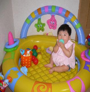 後追いをするので「ココで遊んでてd(^-^)ネ!」って事で夏に水遊びをさせる予定で購入したプールにおもちゃを入れて今から活用しています。
