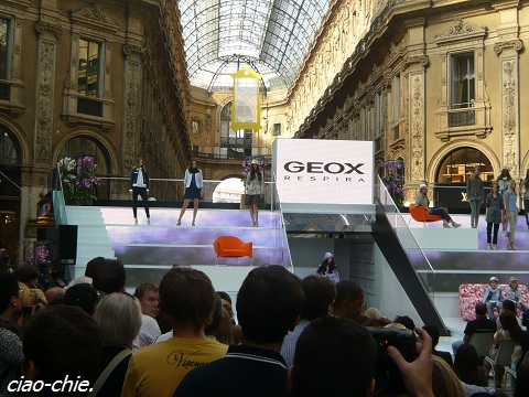 ミラノ名所のひとつ、ヴィットーリオ・エマヌエーレ2世のガッレリアショッピングをしたり、お茶を飲んだりと、楽しみ方はイロイロですが、今回のミラノモーダでは、このガッレリアもファッションショー会場になっていました美しいガラスのドームのちょうど真下で行われていたのは・・ 靴のGEOX(ジオックス)の春夏コレクションこういうスフィラータって、普段なかなか見ることの出来ないイベントですが、ミラノならこうして、誰でも間近で見ることができるんです♪もちろん、シャ○ルとか、アル○ーニなんていうラグジュアリーブランドは招待状がないと行けませんが、むしろこういう身近なブランドのコレクションをいち早く見ることができるんですから、ミラネーゼたちがうらやましいです キレイなモデルさんたちもさることながら、背景のガッレリアの美しい装飾が華やかなファッションショウの雰囲気をさらに盛り上げてくれてますせっかくだから、ショウを最後まで、楽しんじゃいましょう♪・・・という訳で、ガッレリアのスフィラータ、しばらく続きます
