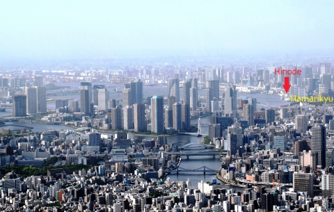 左(北)側方面は隅田川河口とスカイツリーがはるかに見える。