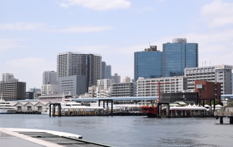 日の出桟橋からの対岸(東)。見えているのは対岸の晴海(はるみ)と、右奧が豊洲(とよす)。