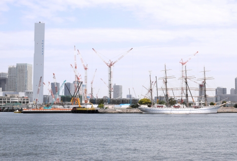 工事のクレーンとマストが重なりあってよく見えないので日本丸のホームページから持ってきました。