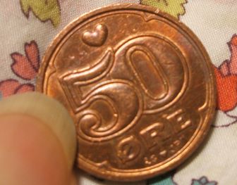 本日、会社で「あげる」と手渡された。宅配のドライバーが、きっと代引きの際にお客さんから間違って手渡された、10円玉と間違って渡されたんだろうな~~って感じの硬貨。一回り小さくて、いつもならさほど考えずにどっかしまうんだろうけど息子に見せたくて、良く見てみた。ヾ(≧□≦*)ノうわっ!!♪可愛い♪デンマークの50オーレコイン。可愛くないですか((*´ω`*))ニャ見難い方に、画像お借りしてきました。ハートが描かれてて、50の文字もアリスのトランプみたい((*´ω`*))ニャネットで検索してみたら、8円ぐらいの価値か(^_^; アハハ…で、見てたら1クローネは幸せを呼ぶコインとしてかなり有名でしたのね。これ、すんごく可愛いですよね~~~(〃∇〃)ストラップになって販売されてる!!欲しい!!ほしいよ~~~私に、幸せを~~~~!!【ハート紋様の1クローネコイン!バレンタインにオススメのハッピーアイテム!】世界でいちばん幸せな国デンマークの「幸せを呼ぶコイン」「幸せを呼ぶコイン」付ストラップゴールド「幸せを呼ぶコイン」付ストラップシルバー