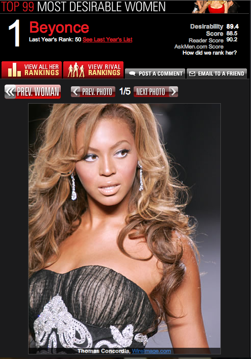 25万人のアメリカ人男性が選んだ『イイ女』トップ99が発表された。堂々の1位はビヨンセ2位 スカーレットヨハンソン キャメロンディアスからジャスティンを略奪したとの噂が ある彼女。可愛いもんなーセクシーだし それだけじゃなくて、なんか昔の女優さんのようなオーラがある3位はエバも大好きなジェシカアルバ☆4位から8位はあまり日本では有名じゃないモデルさん達が続き、、、飛んで、9位もエバの大大好きなアンジェリーナジョリー またまた飛んで17位にディスペラートハウスワイフで人気が爆発したエバロンゴリア19位はジェシカシンプソン お、ここでやっと出て来たか22位にナタリーポートマン そしてそして、エバが昔からだーい好きなコン リー昔、中華三昧のCMにチャイナドレス姿で出ていた女性です。トップ99に入っていてくれたのが、なんかとってもうれしかったので、彼女の写真はもう一枚つけちゃった今日、下の写真を見て気付いたのが、エバのマミーの若い頃にそっくり35位はクリスティーナアギレラ50位にやっとリンジーが出て来ました女の子には大人気で25万人の女性が選んだならトップ10に入ってたであろうシエナミラーが62位 おしゃれさはあまり関係ないのかな?飛んで75位にジェニファーロペス 彼女のヒップラインはすごいですよねー76位にはブラッドピットの元おくさまのジェニファーアニストンエバは彼女はもっと上位だと思ってたので、以外84位にヒラリーダフ 最近すっごくキレイになりましたよね。もうただのアイドルって感じじゃなく、女優オーラ出まくってます、、、って、あれ?私たち女性がいつも注目しているパリス、ニコール、ブリトニーは??99位までにはこの3人、入ってませんでした。選ばれた99人の女性を見ると、アメリカ人男性もやはりコンサバな女性が好きなようですね後、見た目は???な感じでも才能のある女性もトップ99に何人か入っていました。コンサバで、才能を持った女性がこれからはモテる時代なのでしょうか