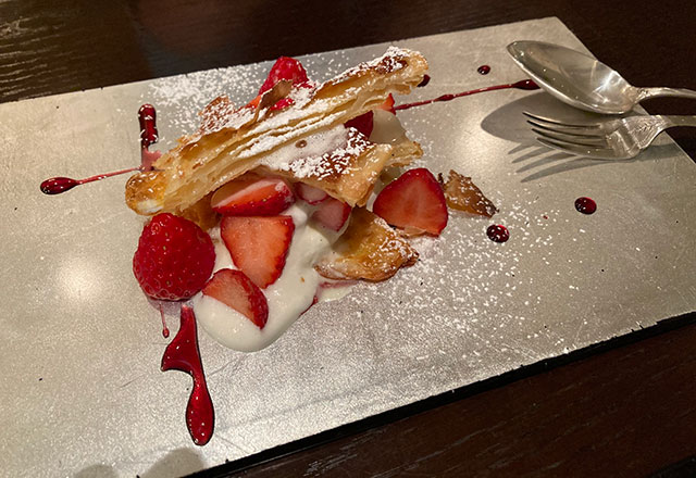 そしてこれがデザート。イチゴとヨーグルトとパイ。それにベリーのソースとシュガーパウダー。銀色の皿とのコントラストがスバラシーよね。