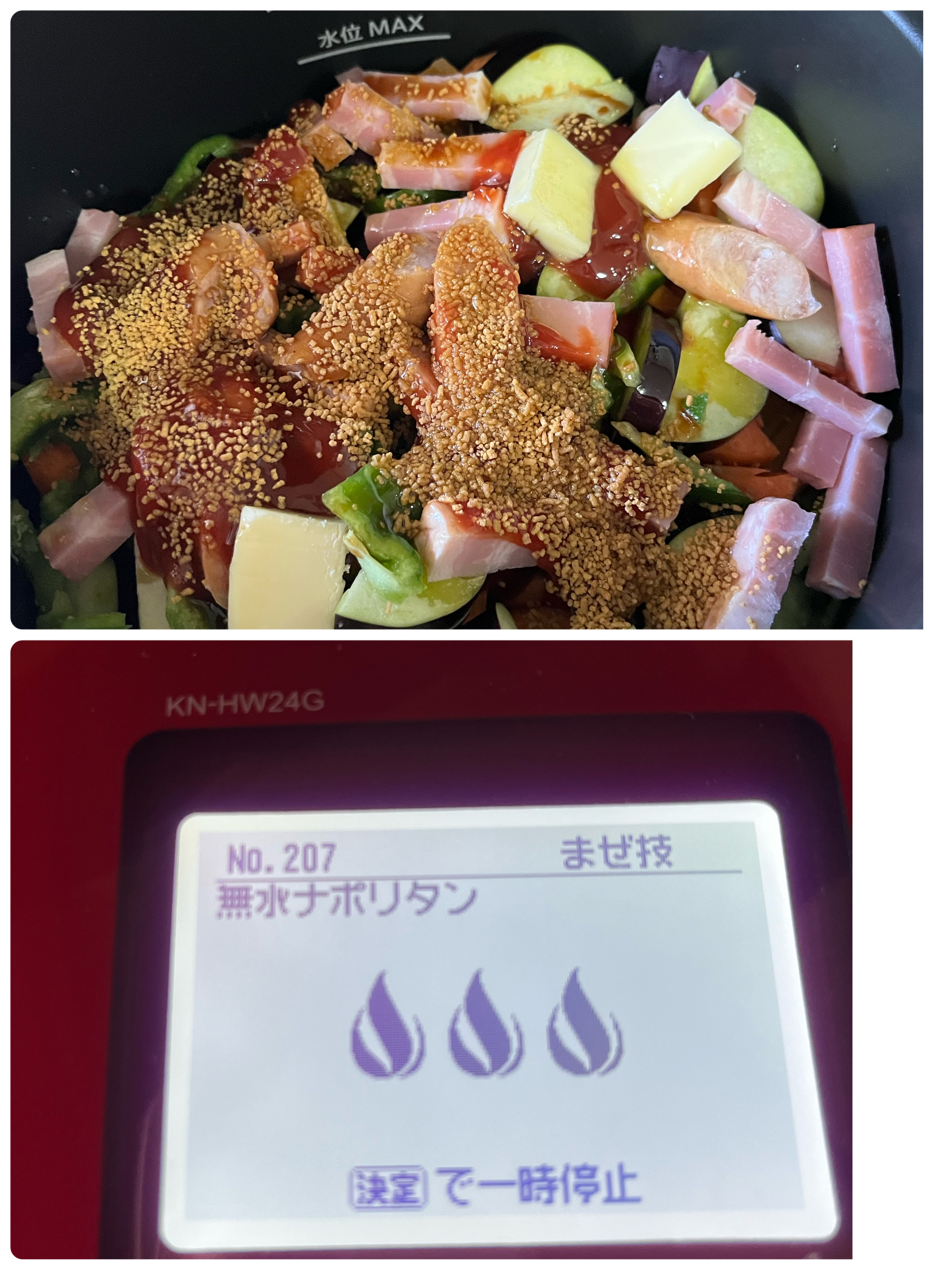 玉ねぎ、プチトマト、ナス、にんじん、パスタ、ベーコン、ケチャップ、ソース、他調味料。
