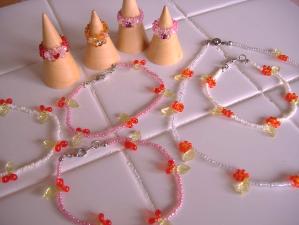 お友達からのオーダーで、久しぶりにビーズアクセを作ってみました。キッズ用のネックレス、ブレスレット、リングです♪小っちゃなチェリーとお花をところどころに・・・。シンプルだけど着けてみるとすご~くかわいいんですよ(*^^*)キラキラリングも作ってみたら、某キッズブランドにも似たようなリングが売ってました(^^)お友達は姪っ子ちゃんたちにプレゼントするそう!気に入ってもらえるかな?(*^▽^*)