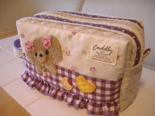 今日は以前の作品で人気のあったものをご紹介します(*^^*)トイプーちゃんの付いた『おむつポーチ』です。リネンのキルト生地をベースに、フリル、トーションレース、ビスケットのデコモチーフなどで、ちょっと凝ってみました♪裏側はこんな感じで、ポケットが付いてます♪こちらは色違いで。『おむつポーチ』に限らず、シューズ入れとしても使える大きさです。2作品とも、すでに県外のお客様のもとへお嫁に行ってしまったので、ちょっと手間がかかるけど、また作ってみようかな(*^^*)