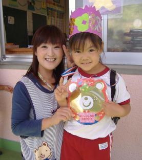 最近急に朝夕涼しくなってきましたが、皆さん体調くずしてないでしょうか?ウチはママ&子供たち、3人揃ってここ2,3日風邪っぴきです(×_×)暑かったので少し窓をあけて寝たら一発でした(^^;)油断大敵ですね・・・。ところで今日は幼稚園で月に一度のお誕生会がありました。9月生まれのはな、冠をつけてごきげんです♪みんなの前でマイクを持って、『名前』と『大きくなったら何になりたいか』を発表するのですが、はなは、「大きくなったら動物園の飼育員さんになりたいです!」。ん??七夕の時は確か『バレリーナ』だったよね・・・あはは、そーなんだ(^^;)。記念に大好きな担任のけいこ先生とパチリ!☆かわいくてお姉さんのようなけいこ先生。はなは去年に引き続き、2年続けて受け持ってもらってます。はな、昨年度末には『先生にいい匂いのクリームを手にぬってもらった♪』ことを思い出としてあげていました。なんだかおマセな女の子と先生の関係が目に浮かんでほのぼのとしました(*^^*)もう最後の年と思うと悲しくなっちゃいますが、まだまだこれからイベント目白押し!先生よろしくお願いしまーす!(^^)