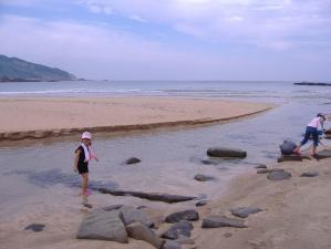 今日は朝からはなのバレエのレッスンでした。お迎えまでの空いた時間に、takana.mamaとスタバで待ち合わせてティータイム♪日曜の朝からカフェなんて、優雅なひと時でした。。.( ̄▽ ̄=)さてさて、午後からは久しぶりにパパがお休みということで、家族でプライベートビーチに!(うそ。)さすがにもう泳げないけど、磯遊びに行ってみました( v^-゚)この場所はたまにサーファーがいるくらいで、ほとんどプライベートビーチ(^^*)小さな川もあって子供が楽しめるのです。到着するなり何か発見!ドラえもんの鈴!?(爆)大きな浮きで、何やら漢字がいっぱい。中国のものみたいです。誰もいなくてゆったりとした時間が流れます・・・。色とりどりのきれいな貝がらもいっぱい!seaママ作・題名『夏の終わり』(笑)ん?子供たちが何か始めました。聞くと「いあい切りの練習。」Wiiスポーツのやりすぎかも・・・(-。-;)この後、帰る間際にまいが見事に川の中ですべり、全身ズブ濡れになって、着替えもなく毛布にくるまって帰ったことは書くべきか・・・あ、書いちゃった(^^;)教訓・・6年生でも着替えは持っていくべし。(笑)そして海での収穫がこちら・・・。またまたうそです(^^;)こちらはパパがいただいてきた北海道土産の『ホッケ』です。その大きさにびっくり!念の為、タバコを置いてみました(笑)このホッケ、アブラがのってめちゃめちゃおいしかったでーす♪