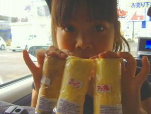 以前ご紹介した『クレープの自販機』。久しぶりに買ってみましたv(^_^v)♪今日は『りんごシナモン』『栗モンブラン』『もちきなこ』中でもモンブラン、美味でした♪ちなみにアシスタントはまい姉さん。「目、大きく開けて~♪」と言ったらなぜか鼻まで・・・(笑)PS.食べてる途中ではなの歯がポロッ・・。 クレープってそんなに硬かったっけ~?(笑) 何はともあれはなちゃん、おめでと~(*^^*)