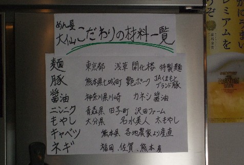今年の仕事が始まり最初の週が終わりました。やっぱ気が乗らないし朝も辛い。そこで明日からの三連休は嬉しいことです。来週はイベントあるし次の週は出張・・・この休みはダラダラせず少し気分しめていかんばかな~(^o^)。遅れに遅れて・・・昨年の食べ納めの記事です。初日は大分、二日目は福岡。そして最終日はもちろん熊本です。事前に交通手段下調べして歩く距離を少なくしようと計画バッチリやっておきました。嬉しいことに高速は渋滞もなくスムーズというか時刻表より10分くらい早く熊本市内にバスは入りました。下調べで行くと終点まで行かずに途中で乗り換えると工程スムーズで早く店につけるんですぅ。ってことで終点の交通センターまで行くことなく途中の水前寺公園前で下車。降りて反対方向のバス停に向かい時刻表を見ると10分後に「御船」行きのバスが来る予定(^_^)v。今までは熊本バスだったんだけど今回は産交バス。これは本数少ないんだけど目的の店までの歩く距離がメチャ近くなるんですぅ。しばらく待つと時刻表どおりにバスが来ました。乗車して走ること30分くらいかな?下調べしてたバス停で下車すると見慣れた風景が・・・ここからなら歩いてすぐばい!過去と比べたら歩く量が4分の1以下で済むんじゃないかな~。坂を少し上って着いたのは「めん屋大仙」ってお店です。ここは今年五回目になります。なんてったって九州のガッツリ系では最強の店です。そしてクオリティかなり高く味も盛りもかなり良いんですよね~。今年の食べ納めにはもってこいのお店です。着いたのは開店少し前で待ちは前に一人でした。そしてドアが開くと・・・普通は券売機で食券買うんだけどそのまま着席です。というのは注文予定の「サイボーグ」ってのは現金対応なんですぅ。カウンターの上に1100円置いて「サイボーグ」を注文です。事前に公式ブログに書き込んでいたりしてたんで店の方と挨拶交わしたり・・・顔を覚えてもらってるみたいv(^o^)v。ファンとしては嬉しいものです。これが大仙こだわりの素材らしいんですが・・・店主さん曰くその日の開化楼の麺はいつもと違ってたらしい。結果的にはいつもと変わらず美味しかったですけどね~。トッピングを聞かれて「ニンニクとネギ」でお願いしました。そして出てきたのはこれです。いつもと変わらず嬉しい野菜の山がそびえ立ってます。ネギの緑は美しく食欲マシマシになります(^_^)/。ニンニクもタップリ入れていただき・・・帰りのバスは・・・とりあえず忘れよう(-_-;。先ずは野菜を別皿(サイボーグは専用の皿が出てくるんですぅ)に取り分けます。そして丼へ!ドッシリとした九州では出ないスープと太い麺の相性はいいですね~。ブタもデカいのがゴロゴロ入ってます。適度な固さとアブラの量がいい感じ。公式ブログに目黒や富士丸板橋、三田と比べてる書き込みがあったけどこちらは都心のよりも多摩系に近いんじゃないのかな?って思うのはボクだけ~?やっぱ美味しいですね~。ガツガツと食べ進んで行きます。そのうちに少し満腹感が出てきて・・・麺の量は同じ筈?なのに「太一商店」のとはここが大きな違いです。なんとか頑張って・・・完食しましたぁb(^o^)b。うん、心身ともに大満足の食べ納めでした。食べ終わり店の方と挨拶!「良いお年を!」なんてね~。店を出ると見ず知らずの方?とお店の女性の方がお話されていました。歩いて行こうとすると「バスでしょ?自分のクルマに乗っていきませんか?」なんて声をかけていただきました。帰りのバスの時間まではまだ時間あるんで遠慮なく熊本市内まで乗せていただくことに(^_^)v。実はこの方・・・名前は「九十九(つくも)さん:もちろんHNでこの名前の由来は・・・凄いもんですb(^_^)b。」って方で大仙の大ファンらしい。そしてお店のをはじめボクのブログまで見ていただいてるようでした。ボクが食べ納めに現れるのを予想されてたみたいやったもんね~(^o^)。帰りにラーメンの話で盛り上がり何時の間にか市内に到着しました。おかげさまで早く楽に移動でき・・・九十九さん、どうもありがとうございました。そして食べ納めにふさわしくガッツリ満足させてくれたお店の方ありがとうございました。この大仙は昨年の12月で開店一周年を無事に迎えられたそうです。今年も何度行くことになるのか?レベル高いガッツリ系作り続けられる様に頑張ってくださいね~。