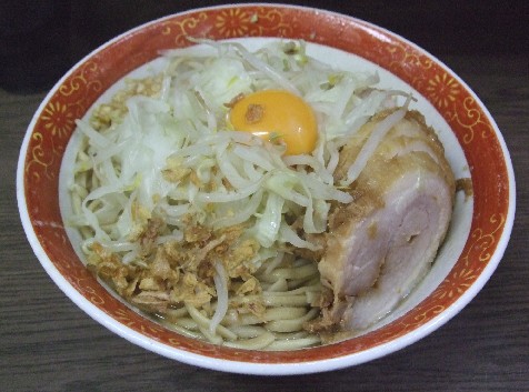 秋分の日の長崎はどんより雲って今にも泣き出しそうな空です。昨日は雨が降ったり止んだり、そのせいか?今朝はかなり涼しくなってます。暑さ寒さも彼岸まで!っていうけど本格的に涼しくなってもらいたいものです。何時までたっても今年は暑いもんな~(+_+)。旅の記事を関内で汁なしを食べた翌日はちょっと遠出してみました。向かったのは相模大野ってところです。ここにも「J」の店舗はあるんですが、店が新しくなってからは行ったことなかったんです。そして、ここにも汁なし系のメニューが出来てるって情報入手し・・・ちょっと遠いけど行ってみました。駅前再開発工事やってて判りにくい?かとも思ったけど近所のお店の案内看板があったんで迷うことなくスムーズに到着です。新しいお店は広くてカウンターの背中側にはご神体が飾られていました。行列は店内に6人くらいの待ち。それほどキツくなくて良かったっす。店内覗いてると食べてる最中の携帯電話?か何かで店主から指導?があってました。いや~緊張感ビシビシ感じます(^_^)b。そのうちに順番が来て食券購入です。買ったのは「小ブタ:800円、温泉玉子:50円、賄い:200円」です。この「賄い」ってのがこのお店の汁なし系メニューになります。先ずは温泉玉子が運ばれ殻を割って待機します。しばらく待ってトッピングを聞かれ・・・ニンニク少しの野菜増しでお願い。そして運ばれて来たのがこれです。目に付くのが二つ重ねられた丼!空の丼で混ぜてくださいってことみたい。逆に野菜とブタを空の丼に避難させ、麺と野菜と温泉玉子を混ぜ合わせます。そして麺を口に運ぶと・・・冷たいっす。これは茹で上がった麺を水でさらしてその後に濃いタレをかけるスタイルのようです。汁なしと言ってもつけ麺からの進化形ですね。しっかし野菜の盛りもブタの量も結構ありました。関内よりは量がかなり多い。ブタは大きいのがゴロゴロ入って柔らかく美味しかったですね~(^_^)v。麺は冷たいんで汗に苦しむことなく食べ進められます。味付けは若干濃く感じましたね。量がかなり多いのか?はたまたトッピングの揚げ玉や濃い味付けのもののせいか?途中でさすがに苦しくなってきました(>_